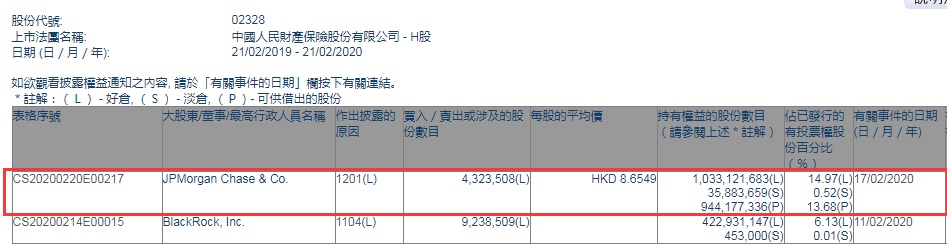 智通财经APP获悉,联交所最新资料显示,2月17日,摩根大通减持中国财险(02328)432.35万股,每股作价8.6549港元,总金额约为3741.95万港元。减持后最新持股数目约为10.33亿股,最新持股比例为14.97%。