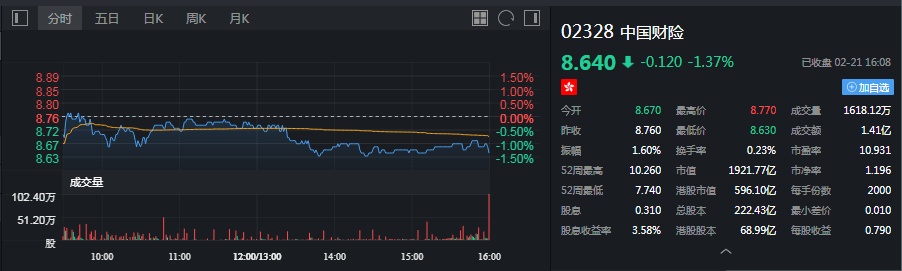 截至今日收盘,中国财险(02328)跌1.37%,报8.64港元。