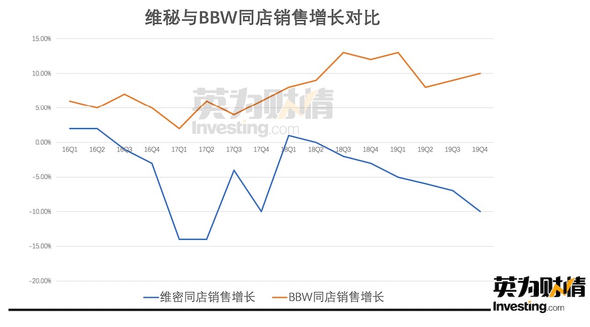 根据L Brands的预期,其四季度可比同店销售预计会出现2%的下滑,其中维密料下跌10%,而BBW预计增长10%。从2016年L Brands股价开始走下坡路算起,BBW的同店销售额一直维持增长,2018年开始更是有增长加速的态势,与维密的表现在着天壤之别。