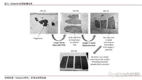 1)原纤维化(Fibrilization):特斯拉收购Maxwell的一项重要技术理由可以归结为“原纤维化(Fibrilization)”。Maxwell的干电极工艺通过将混入活跃的负极或正极材料颗粒的PTFE(Teflon)原纤维化,形成负极或正极材料的自支撑膜(self supporting film)。