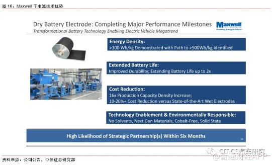 3)低成本。预计这个是公司收购Maxwell最大的出发点。Maxwell认为产能效率有望提升16倍。与现有溶剂涂布电极技术相比成本降低 10%-20%+。此项技术消除或基本上减少了电池制备过程中水和溶剂的使用,消除或基本上减少了杂质以及相关的干燥步骤和设备,提高电池比容量,降低生产成本。