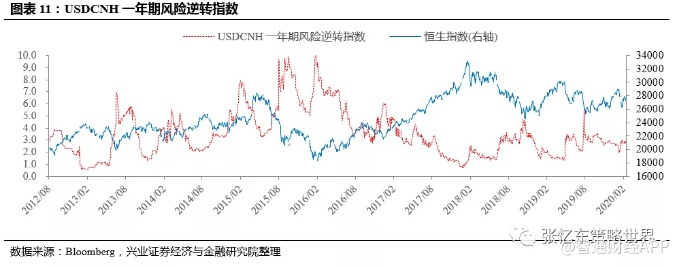 历史上看,反映人民币贬值预期的USDCNH一年期风险逆转指数与恒指收益高度负相关,近期该指标经历了一个低位爬升从2月6日的2.76上升到2月21日的2.94,短期值得警惕。以史为鉴,2018年10月该风险逆转指数从10月1日的2.66上升到局部高点10月26日的4.60,港股大跌;2019年8月初风险逆转指数的急升,从8月1日的2.30上升到8月5日的5.48,对应着恒指的急跌。从逻辑上,贬值预期使得内资港股人民币计价EPS存在汇兑“缩水”风险。