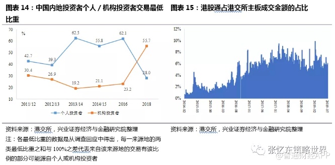 2)短期,港股市场不似以往“离岸市场”般脆弱,中国内地机构资金将成为港股市场的短期“托底”力量。自2014年沪港通开通以来,得益于中国内地与中国香港两地股票市场互联互通机制不断完善,中国内地投资者交易金额在港股市场占比不断提升,2018年度南向交易日均较2017年增长了30%。中国内地投资者内部结构看,2018 年过半数来自机构投资者(由2016 年的至少23%升至2018 年至少56%),以保险机构为代表的中国内地机构投资者通过港股通流入港股,推动中资机构投资者交易金额占比提升。