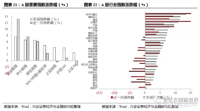 1、A股本周普涨,创业板指(涨7.6%)、中小板指(涨6.5%)领涨。上证综指涨4.2%,沪深300涨4.1%,上证50涨2.5%。行业上,电子元器件(涨13.3%)、国防军工(涨11.5%)和通信(涨11.2%)领涨。陆股通,本周净流入金额64.94亿人民币,主要流入食品饮料、计算机和汽车,流出非银行金融、家电和银行。