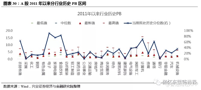 轻工制造(19.9%)、传媒(19.5%)、有色金属(18%)、化工(16.4%)、纺织服装(15.1%)、钢铁(13.7%)、房地产(8.1%)、商业贸易(4.2%)、建筑装饰(2%)、银行(1.3%)、采掘(1%)、公用事业(0.8%)行业市净率处于相对较低分位数水平(括号内为其分位数数值)。