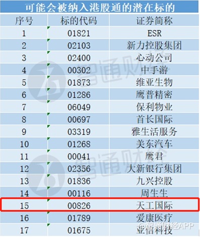 根据WIND数据,目前除已纳入恒生综合大中型指数成分股,基本确定纳入港股通标的中国飞鹤(06186)、JS环球生活(01691)、维达国际(03331)以及滔搏(06110)外,还有可能纳入港股通标的的17家公司,天工国际位列其中。