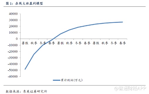 根据我们的模型假设,若一个在线大班平台暑期低价获客100万人(低价班价格50元,获客成本400元/人),正价班转化率25%(正价班价格1300元),续班率70%,该在线大班有望在一年之后达到盈亏平衡。