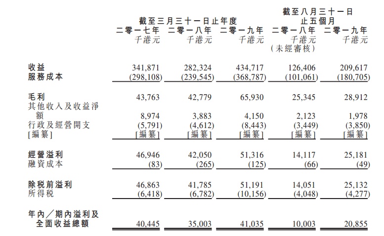 业绩方面,截至2019年3月31日止的三个年度各年,以及截至2019年8月31日止的5个月,毛利率分别约为12.8%、15.2%、15.2%及13.8%。毛利率变动乃主要基于期间所所完成工程的性质。截至2018年3月31日止的年度,溢利及全面收益总额同比减少约540万港元或13.5%,主要因上一年度出售土地及楼宇的收益净额约670万港元所致。截至2019年3月31日止的年度,溢利及全面收益总额同比增加约600万港元或17.2%。