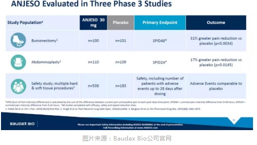 该批准是基于两项检验疗效的3期临床试验,和一项检验安全性的3期临床试验,和四项2期安全性临床研究的结果。两项疗效试验的结果显示,在接受拇囊炎切除术患者的临床治疗中,与安慰剂组相比,接受Anjeso治疗后48小时内疼痛强度差的时间加权总和(SPID48)指数降低了31%。在接受腹壁成形术患者的临床治疗中,与安慰剂组相比,接受Anjeso治疗后24小时内疼痛强度差的时间加权总和(SPID24)也达到统计学意义上的显著改善。