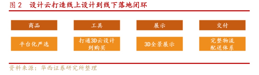 2)所见即所得,家居购设计方案等于购买方案。家居购是专为家装公司、设计师和品牌商所搭建的家居软装补充供应链平台。双方可以相互建立合作,通过3D云设计调用与SKU打通的商品模型进行方案设计,最终实现设计方案等于购买方案。同时,品牌经销商可通过快速设计生成全景方案驱动二次到店,实现设计营销。不同品类经销商之间亦可形成线上联盟,在方案中互相植入模型,拓展客流、降低营销成本。
