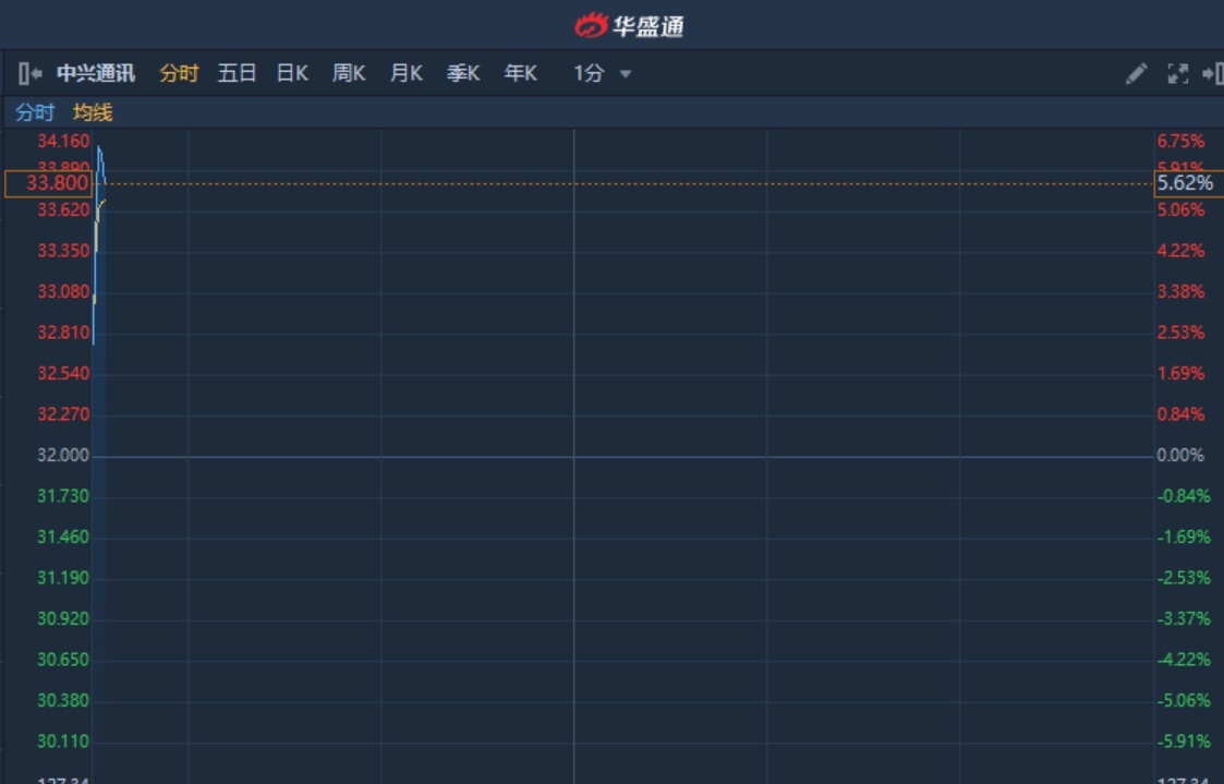 智通财经APP获悉,工信部指加快5G特别是独立组网建设步伐。中兴通讯(00763)早盘AH股同步上扬。涨幅均超6%。截至9时33分,涨6.09%,报价33.95港元,成交额1.071亿。