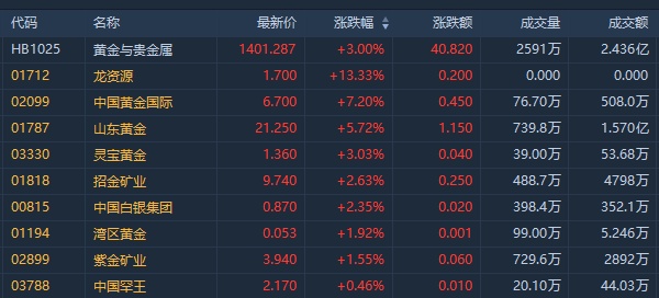截至发稿,中国黄金国际(02099)涨7.36%,报6.71港元;山东黄金(01787)涨6.22%,报21.35港元,盘中刷新历史新高;招金矿业(01818)涨2.53%,报9.73港元;紫金矿业(02899)涨1.55%,报3.94港元。