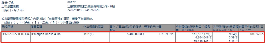 智通财经APP获悉,联交所最新资料显示,2月18日,摩根大通增持宁沪高速(00177)548万股,每股作价9.8916港元,总金额约为5420.6万港元。增持后最新持股数目约为1.1亿股,最新持股比例为9.04%。
