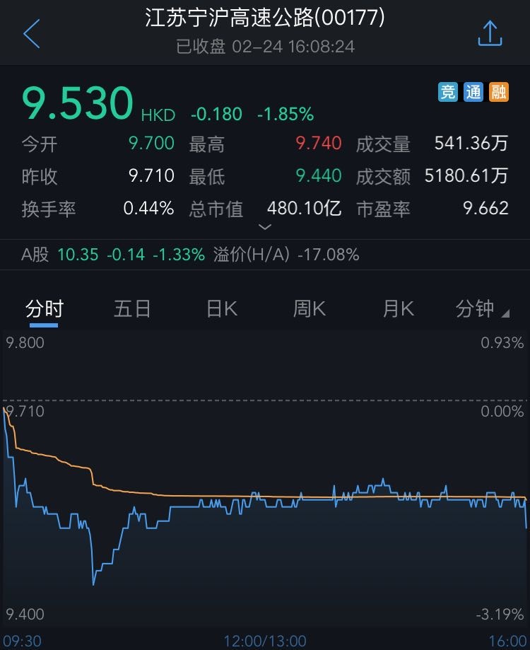 截至今日收盘,宁沪高速跌1.85%,报9.53港元。