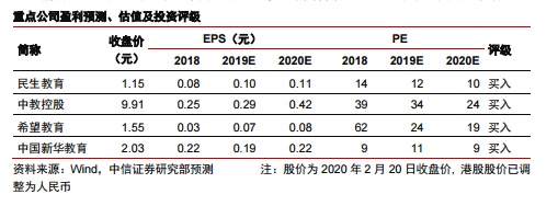 山西“分类登记实施办法”进一步佐证民办高校转设“营利性”的前景。同时,独立学院转设提速、“稳就业”支持技能培训等因素将提振高教板块基本面,2020年3月部分个股迎来年报季,有望迎来“业绩期行情”,板块估值仍然处于低位,建议积极配置。重点建议配置民生教育、中教控股、希望教育、中国新华教育,同时重点关注新高教、建桥教育、中汇集团、华立大学、中国科培、辰林教育等优质高教个股。