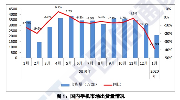 智通财经APP获悉,今日(2月24日),中国信通院公布2020年1月国内手机市场运行分析报告。报告指出,1月国内手机市场总体出货量2081.3万部,同比下降38.9%,其中2G手机34.6万部、4G手机1500.3万部、5G手机546.5万部。