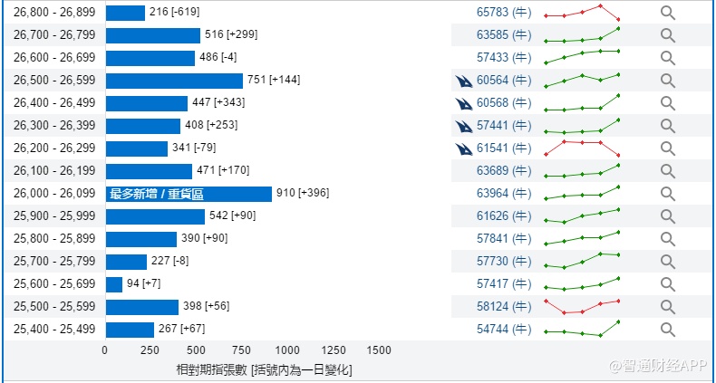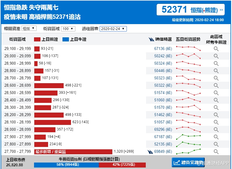 智通财经APP获悉,截至2月25日,恒指最新的牛熊街货比例58:42。瑞信恒指牛熊证街货分布图中的数据显示,熊证街货重货区在27700-27799区间,该区间最新熊证数量为1320张,较上一交易日增加269张,最多新增也在此区间。牛证街货重货区在26000-26099区间,该区间最新牛证数量为910张,较上一交易日增加396张,最多新增也在此区间。