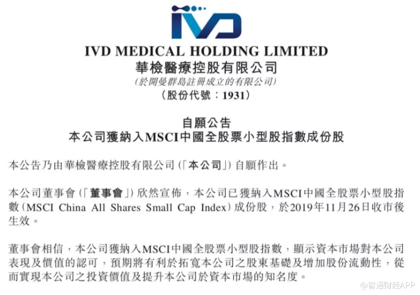 智通财经APP观察到,早在去年11月8日, 明晟(MSCI)宣布了指数季度调整结果。在此次调整中,中国小型指数新增27支股份,华检医疗便名列其中。受此利好消息影响,华检医疗当日最高涨幅达到8%。随后在11月25日,华检医疗再次发布公告宣布其正式纳入MSCI中国小型股指数成分股。