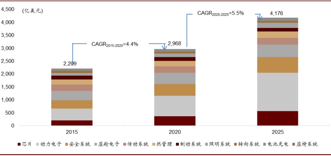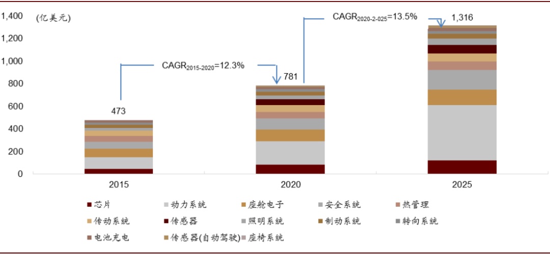 图表: 中国2020-2025年汽车电子市场接近翻倍,CAGR2020-2025约13.5%