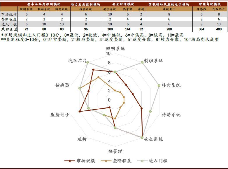 我们将以上6个投资领域按照市场规模、垄断程度、进入门槛打分,得到了产业链投资机会图谱,其中考虑到芯片和智能座舱经过多年发展,在域架构或者中央计算架构下垄断程度有适当提升。