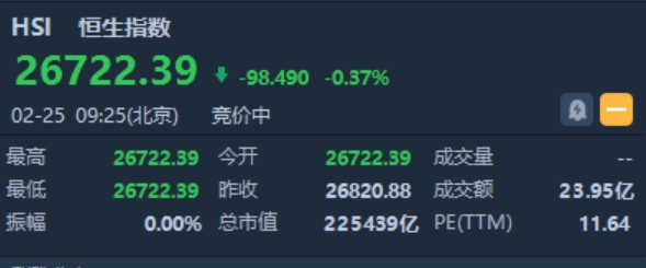 智通财经APP获悉,恒生指数开盘跌98.49点或0.37%,报26722.39点。国企指数跌0.3%,报10536.33点。红筹指数跌0.7%,报4166.86点。大市盘前成交23.95亿港元。