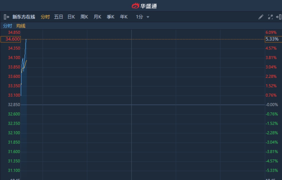 智通财经APP获悉,隔夜美股跟谁学(GSX.US)逆市大涨并创新高,新东方在线(01797)早盘急升逾5%,截至9时38分,涨5.33%,报价34.6港元,成交额3621万。