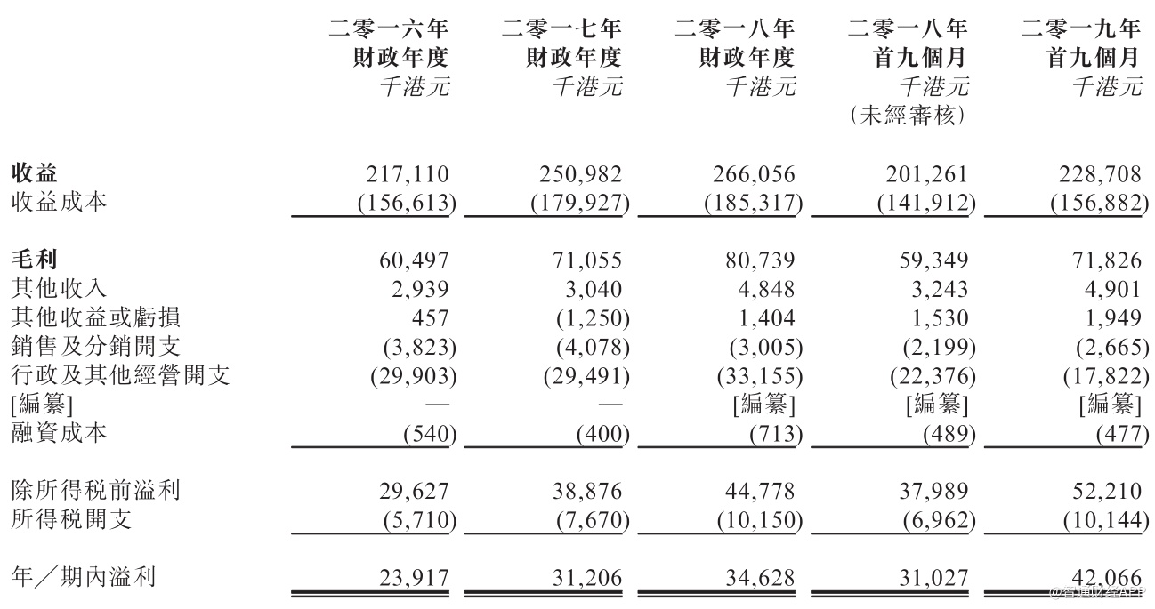 招股书显示,集团于2016年、2017年、2018年分别实现收益为2.17亿港元、2.51亿港元、2.66亿港元;毛利率分别为27.9%、28.3%、30.3%;期内溢利分别为2391.7万港元、3120.6万港元、3462.8万港元。2019年前九月,公司收入为2.29亿港元,同比增长14%,毛利率为31.4%,期内溢利为4207万港元,同比增长36%。上述期内,公司收入最主要来源为风扇,收入占比分别为55%、47.2%、48.1%以及51.6%。