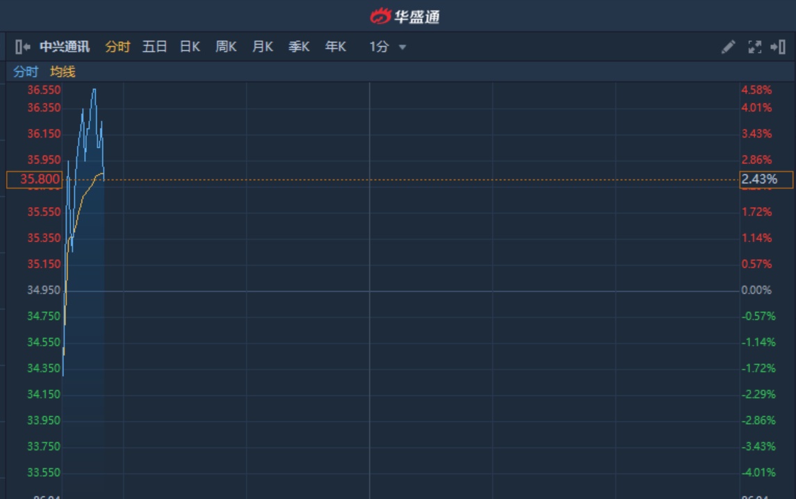 ,H股盘中升逾4%,高见36.7港元,创历史新高,截至9时49分,涨2.43%,报价35.8港元,成交额3.135亿。