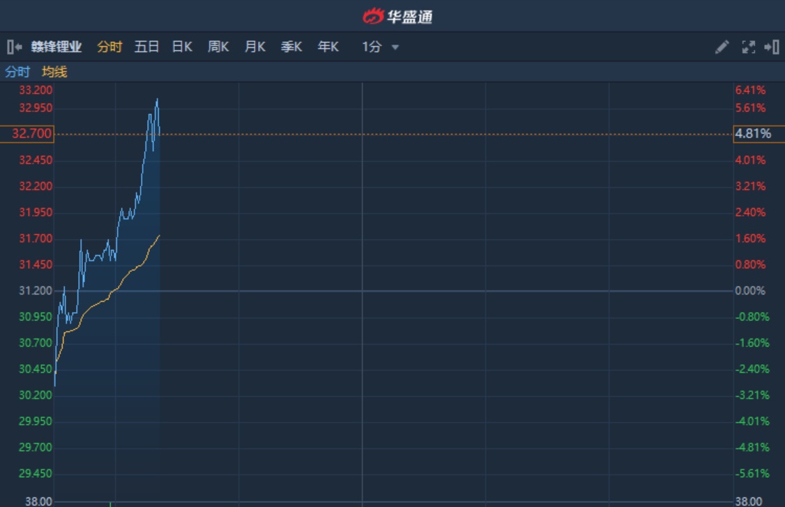 智通财经APP获悉,赣锋锂业(01772)重获资金追捧,早盘AH股同步上扬,盘中均涨超5%。截至10时20分,涨4.81%,报价32.7港元,成交额1.522亿。