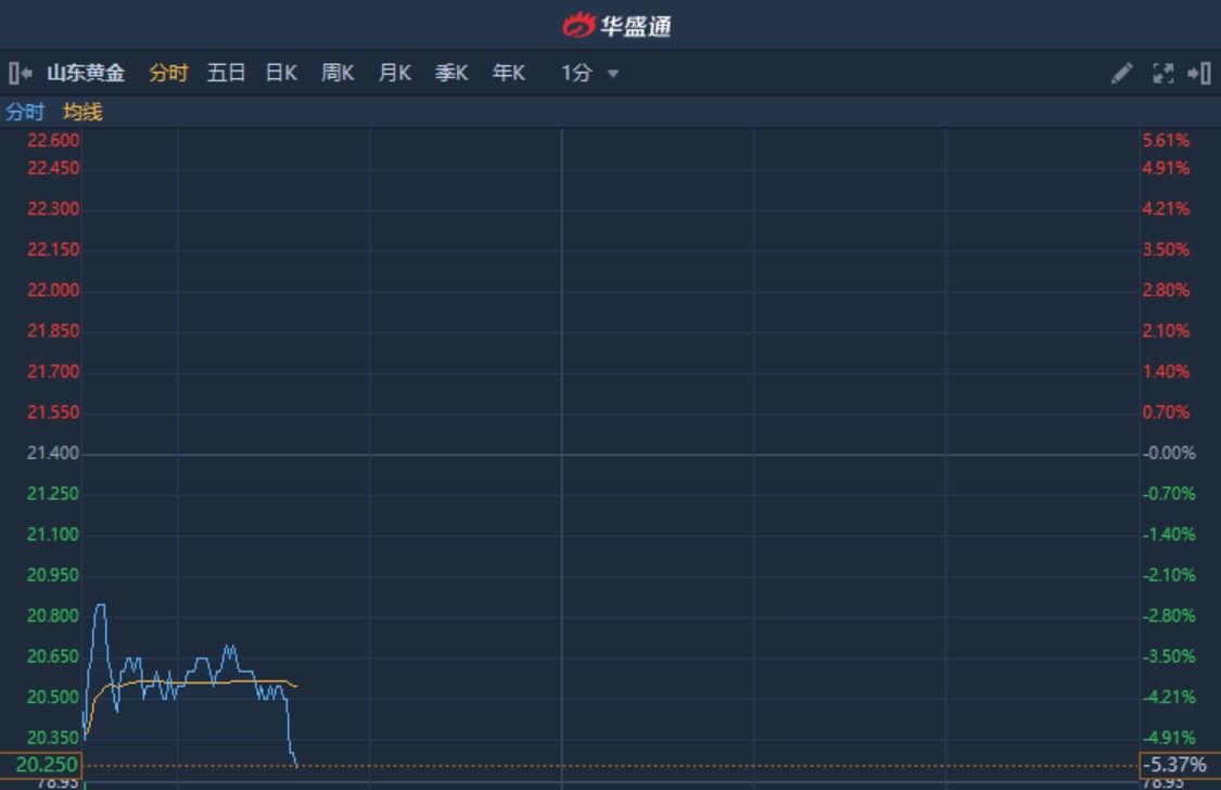 智通财经APP获悉,山东黄金(01787)新高后股价高位回吐,盘中放量急挫逾5%。截至10时36分,跌5.37%,报价20.25港元,成交额1.101亿。