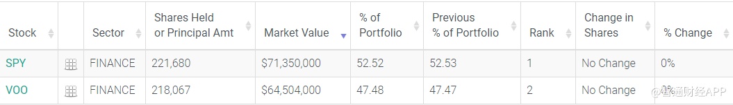 其标的标普500ETF-SPDR(SPY.US)和标普500ETF-Vanguard(VOO.US)分别占比约52.52%、47.48%。持仓时长为23.5季度。