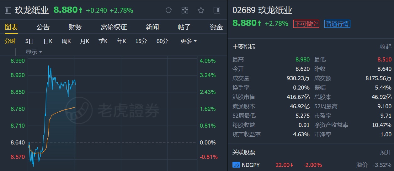 该行预计,内地废纸供应紧张的情况短期内难以舒缓,今年进口配额预计将同比进一步下跌35%,相信通过抢占大部分进口配额,集团将继续享有成本优势。集团的定价能力强、具成本优势、有新增产能,以及市场预期较低,且该股现价相当于2020年预测市帐率0.9倍,市盈率6.2倍。该行表示维持对其“跑赢大市”评级,目标价11.8港元。
