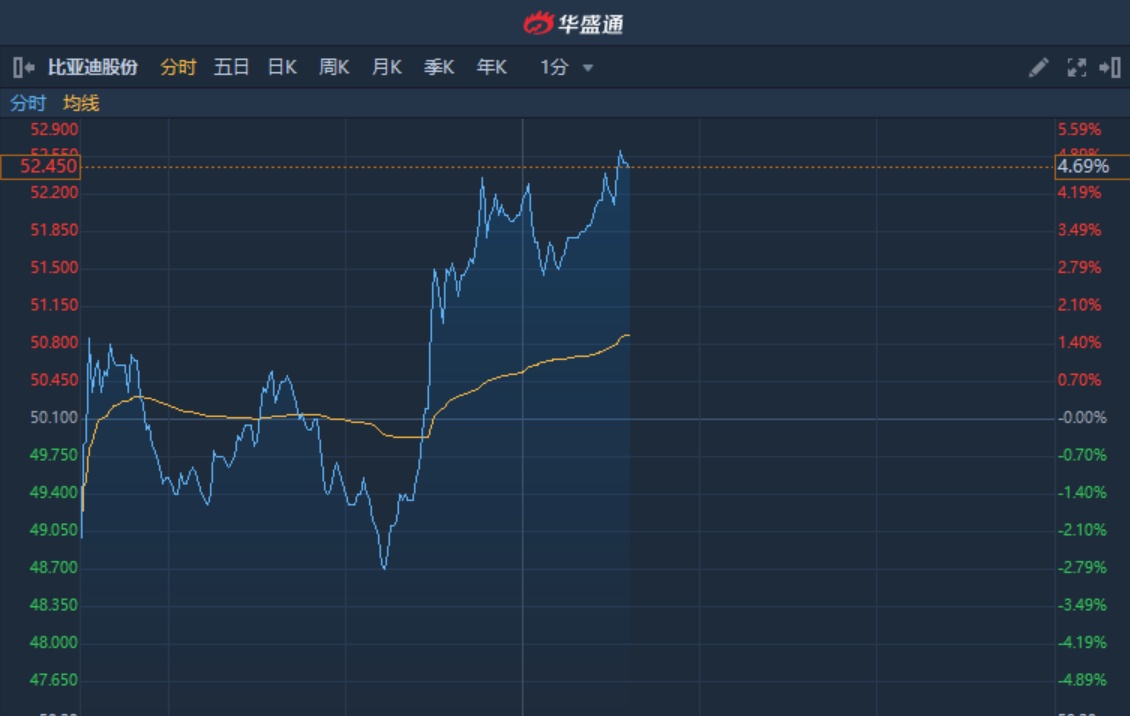 智通财经APP获悉,比亚迪股份(01211)A股盘中涨超8%,H股跟涨逾4%,截至13时35分,涨4.69%,报价52.45港元,成交额6.031亿。