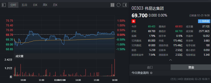截至今日收盘,伟易达无涨跌,报69.70港元。