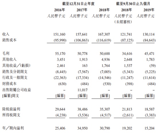 招股书显示,深蓝科技的97.7%的营收来自于中国内地,2016-2018年内,公司的收入由1.51亿元(人民币,单位下同)增长至2018年时的1.67亿元,虽然营收看似稳健的成长,但年复合增长率仅约5.2%,并算不上一个很高的增速。而截至2019年前三季度,营收虽然较上年同期有所增长至1.3亿元,但纯利却较上年同期的1920.2万元下滑至1520.4万元。