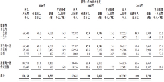 细分品类来看,公司的产品主要为涂层剂和合成树脂,涂层剂包含着色剂、表处剂及助剂三类,着色剂和表处剂是公司收入的两大产品。公司的产品主要以涂层剂为主,直至2018年,涂层剂贡献全年总营收达到86.6%,而合成树脂贡献剩下13.4%的营收。