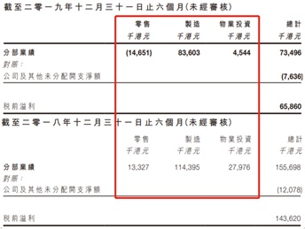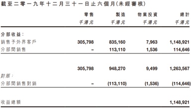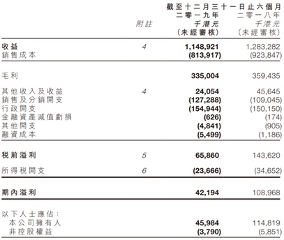 截止2019年末的6个月,公司零售业务录得3.06亿元的对外收入,较去年同期增长36.39%,同时物业投资业务营收同比上涨33.74%至796.3万元,部分缓解了制造业务营收的大幅下滑,使得公司营收规模同比减少10.47%至11.49亿元。而毛利方面,由于营收录得增长的零售业务毛利率较高,使得公司整体毛利率由去年同期的28%增至29.2%,因此3.35亿元毛利仅同比小幅下滑6.8%。
