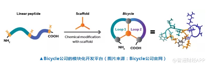 Bicycle公司致力于将双环肽技术(名为Bicycle)用于差异化疗法的开发中。双环肽分子集抗体、小分子药物及肽类的特性于一身,具有与抗体类似的亲和性和精确的靶向特异性;同时,由于它们分子量较小,使得其能够快速深入地渗透组织,从而实现从组织内部靶向病灶;其肽类的性质则提供了“可调控”的药物动力学半衰期和肾脏清除途径,从而避免了其他药物形式中常见的肝脏和胃肠道毒性。