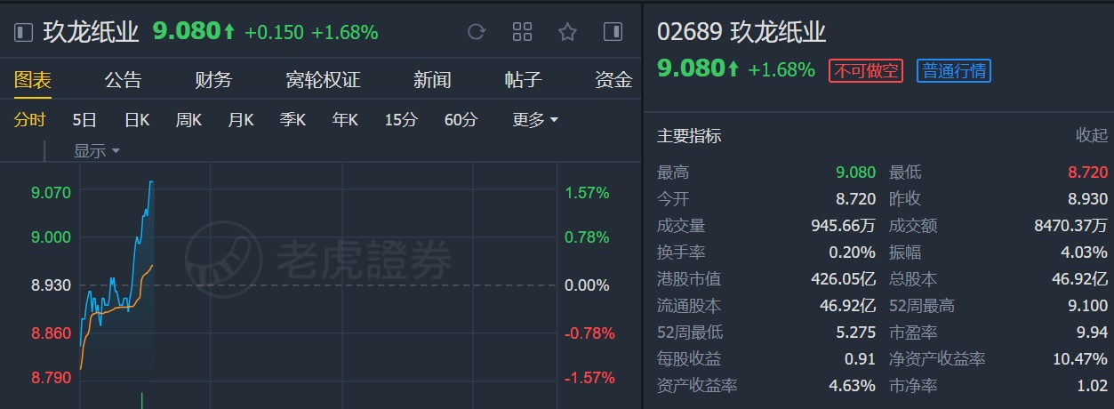 该行还称,玖纸业绩超预期主要受益于毛利率改善,同时销量增长强劲,公司2020财年下半年业绩有望同比显著改善。该行分别上调该公司2020和2021年归属于母公司纯利预测47.2%和31.2%至49.11亿和46.23亿元人民币。另外 ,公司日前公布截至2019年12月31日止六个月业绩,纯利为22.79亿元人民币,同比上升0.52%,每股基本盈利增加0.01-0.49元人民币。