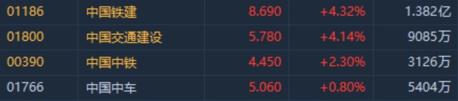 智通财经APP获悉,基建板块随A股集体走高,中国铁建(01186)暂领涨板块,截至10时42分,涨4.32%,报价8.69港元,中国交通建设(01800)涨4.14%,报5.78港元,中国中铁(00390)涨2.3%,报4.45%。
