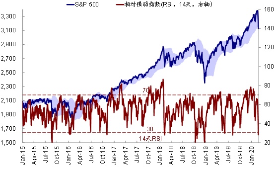 美股技术上已经超卖,但短期内不排除仍会出现波动或者震荡盘整。经过连续两天的快速下跌后,美股市场在技术上已经明显超卖(RSI低于30)。从历史经验来看,这一指标虽然不能作为衡量市场底部的绝对参照(因为可以在低位徘徊一段时间),但可以从一个角度表征情绪的极端。
