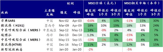 我们在此前时间发现基点规律:1)并非每次都对市场产生较为持续且广泛的影响,实际影响取决于传播范围、严重程度、以及当时的市场和宏观环境;2)对主要爆发地市场的冲击幅度要大于全球其他市场;3)单纯事件本身并非改变市场趋势的因素,而且高峰期过后,市场普遍都会出现明显修复;4)跨资产比较看,风险资产通常更为受损,避险资产有一定防御性。