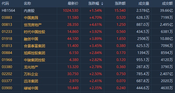 截至发稿,中国奥园(03883)涨4.88%,报11.6港元;世茂房地产(00813)涨4.43%,报28.3港元;时代中国控股(01233)涨3.92%,报14.86港元;融创中国(01918)涨3.89%,报44.1港元。