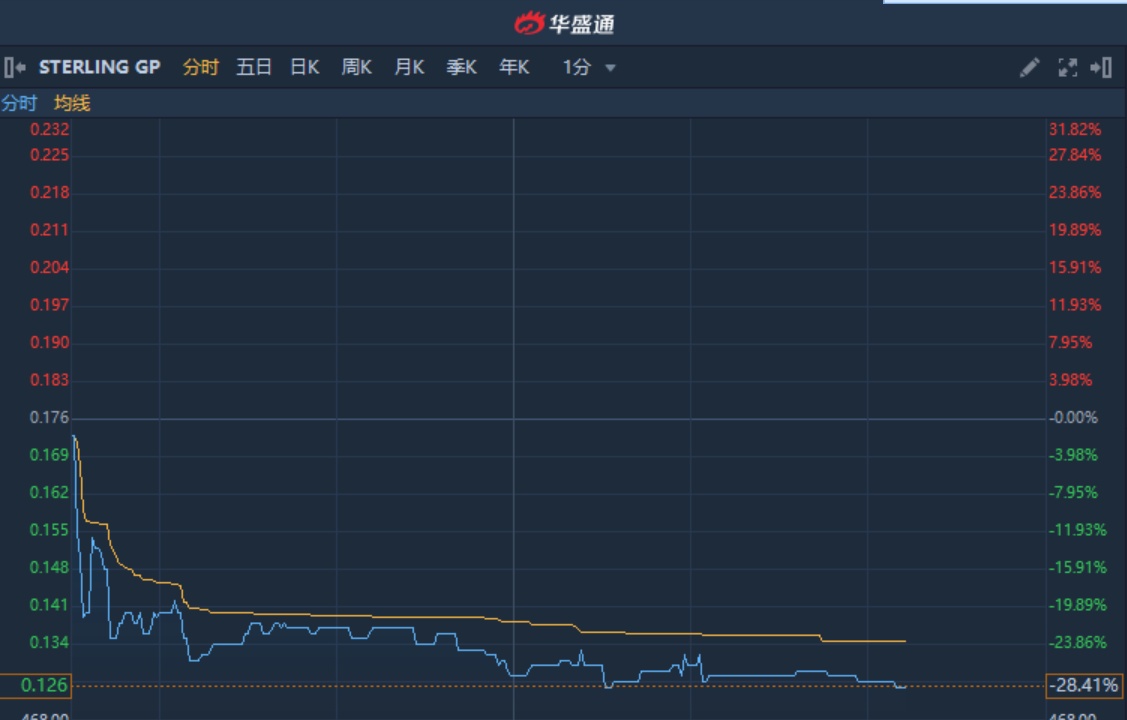 港股异动︱细价股STERLING GP(01825)无量下挫28% 暂居跌幅榜首位