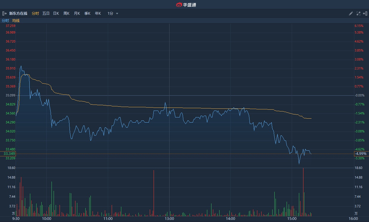 智通财经APP获悉,新东方在线(01797)早盘冲高至2%后转跌,尾盘跌幅扩大逾5%。截至发稿,跌4.99%,报33.35港元,成交额1.74亿港元。