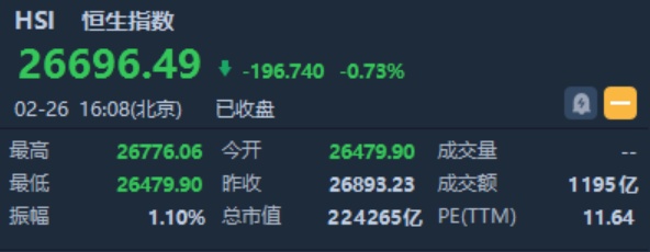 智通财经APP获悉,恒指早盘低开413.33点或1.54%,报26479.9点。截至收盘,恒生指数跌196.74点或0.73%,报26696.49点,全日成交额达1195.97亿。国企指数跌0.74%,报10501.62点,红筹指数跌1.25%,报4128.56点。