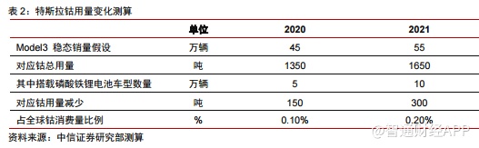 即使特斯拉电池技术路线切换,对钴用量影响较小。特斯拉当前车型中使用的电池正极材料中钴含量预计在3%(质量分数),按照每辆国产Model 3配套65kWh电池计算,10万辆Model 3对应的动力电池装机量约6.5GWh,需要正极材料(NCA 或 NCM811)约1万吨,对应钴用量300吨(金属量)。假设2020/2021年搭载磷酸铁锂的特斯拉车型数量分别为5万辆/10万辆,对应钴金属用量减少150/300吨,对全球钴消费影响较小。