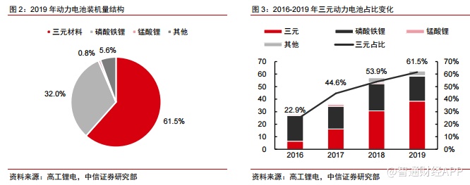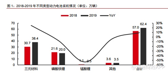 2019年仅三元动力电池装机量同比上升。根据高工锂电数据,2019年1-12 月,我国动力电池装机量累计为62.4GWh,同比增长9.5%。其中三元电池装机量累计38.4GWh,同比增长25.0%;磷酸铁锂电池装机量为20.2GWh,同比下降9.0%;锰酸锂电池装机量仅为 0.5GWh,同比下滑 53.6%。除三元电池外,其他类型电池装机量均出现下降。