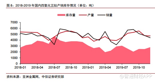 国内四氧化三钴产销量恢复,库存处于低位。