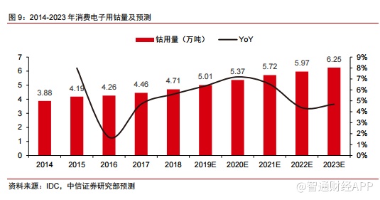 预计2019-2023年消费电子领域用钴保持6%的年均增速。根据我们测算,2018年全球消费电子产品用钴量约为4.71万吨,2019年预计增长至5.01万吨,增长约3000 吨,同比增长6.4%,增量主要来自电子产品单机带电量提升。随着5G时代来临拉动手机出货量重回正增长以及新兴领域消费的增长,2020-2023年预计消费电子领域钴消费将保持每年3000吨左右的增速,到2023年有望增长至6.25万吨,2019-2023年CAGR为6%。